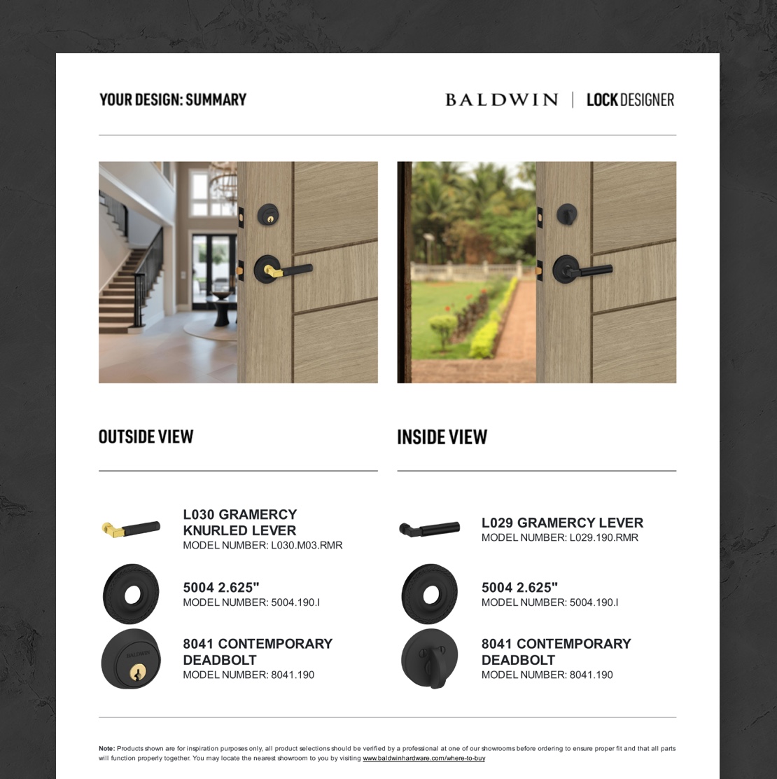After narrowing down the options, the lock designer presents selected options in a realistic visualizer while the user customizes their combination. A large preview image lets users see all the beautiful details and a compact set of swatches allows them to explore all the options without tedious navigation.
